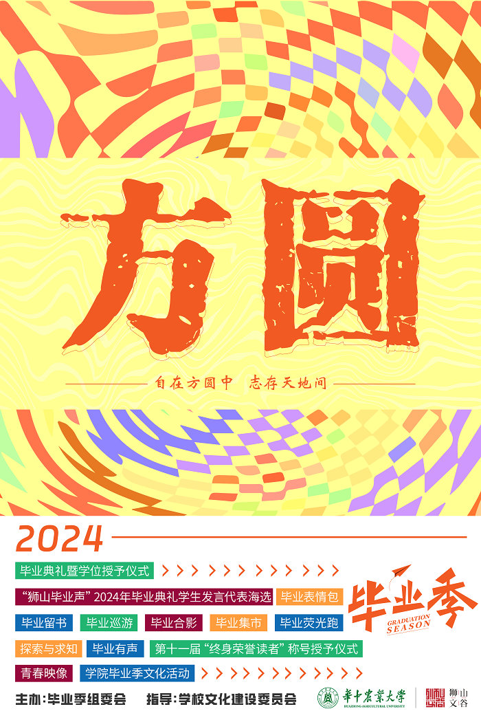 学校弘扬百余年历史积淀的厚重文化,秉承以“勤读力耕、立己达人”为核心的华农精神,坚持“手脑并用、知行合一”的育人传统,践行“育人为本、崇尚学术”的办学理念,遵循“团结、勤俭、求是、奋进”的优良校风,坚守“不张扬、不浮躁、不盲从”的华农品格,彰显“现代生物科技、信息科技、工程科技与传统农科紧密结合、互促共进,培养创新人才”的办学特色。[详细]